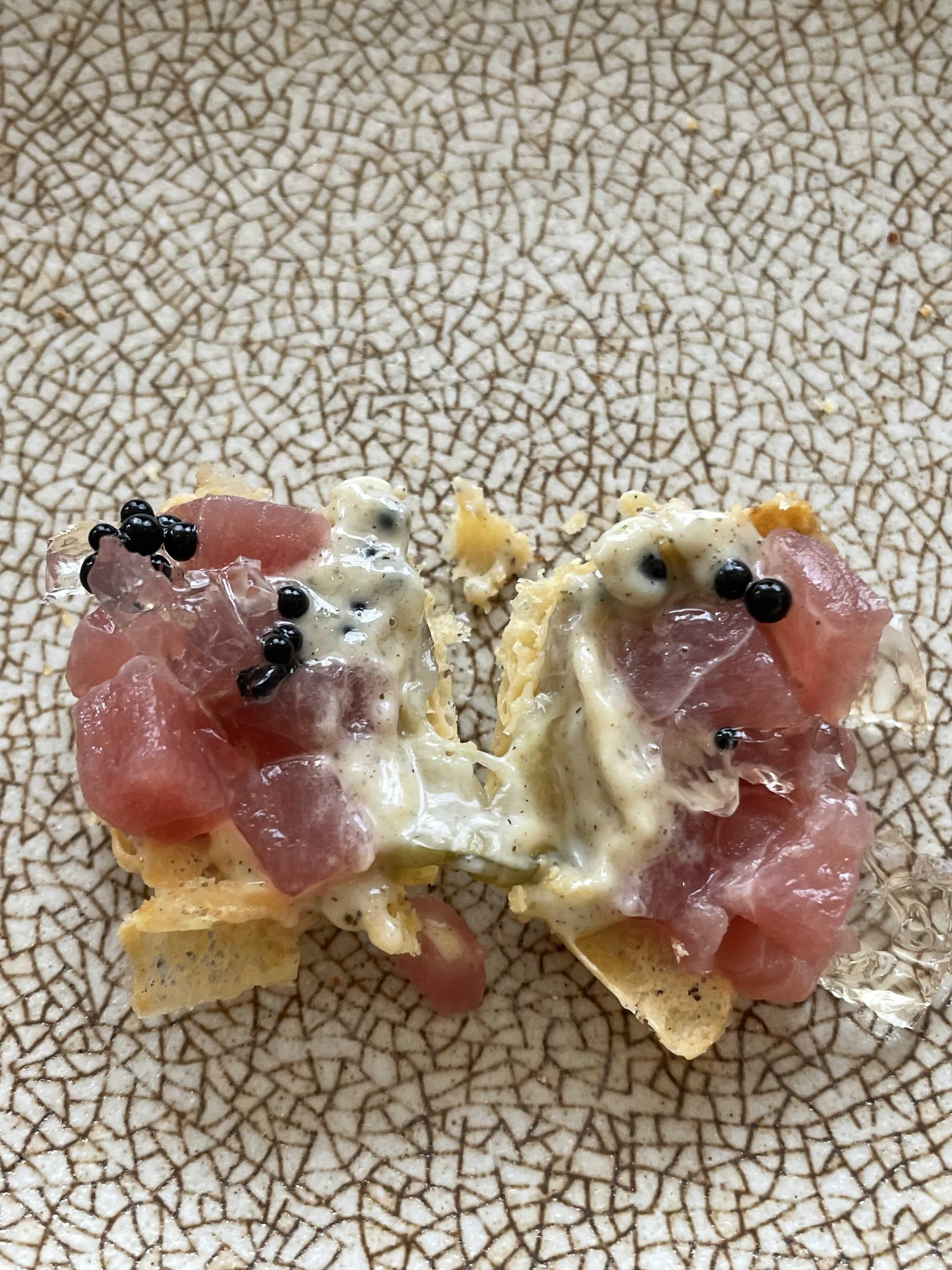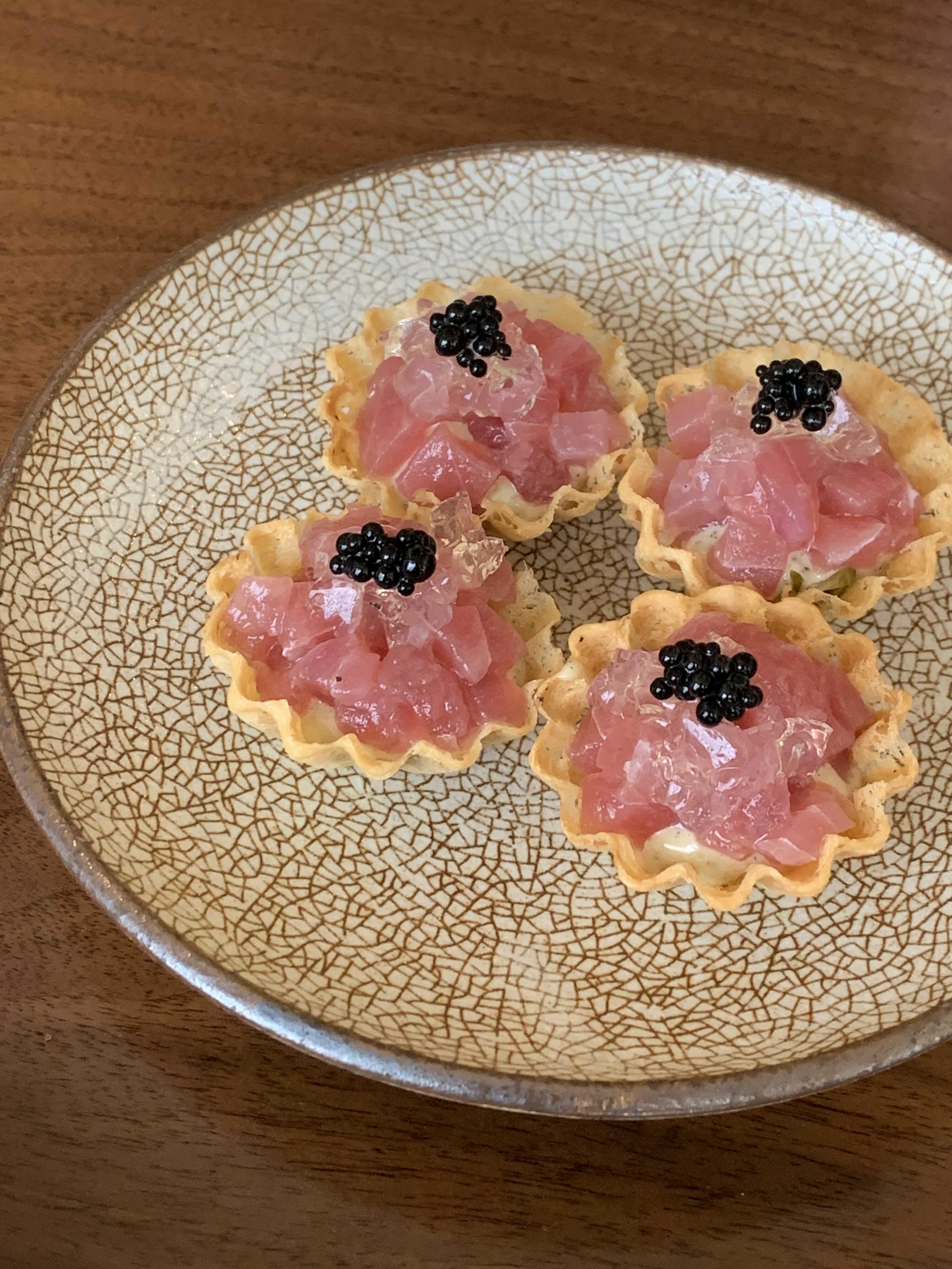 두 번째 메뉴는 튜나 타르트예요. 아주 작고, 얇은 미니 타르트지 위에 오이지와, 다시마에멀젼, 다시마젤리, 참치가 올란 간 메뉴입니다.