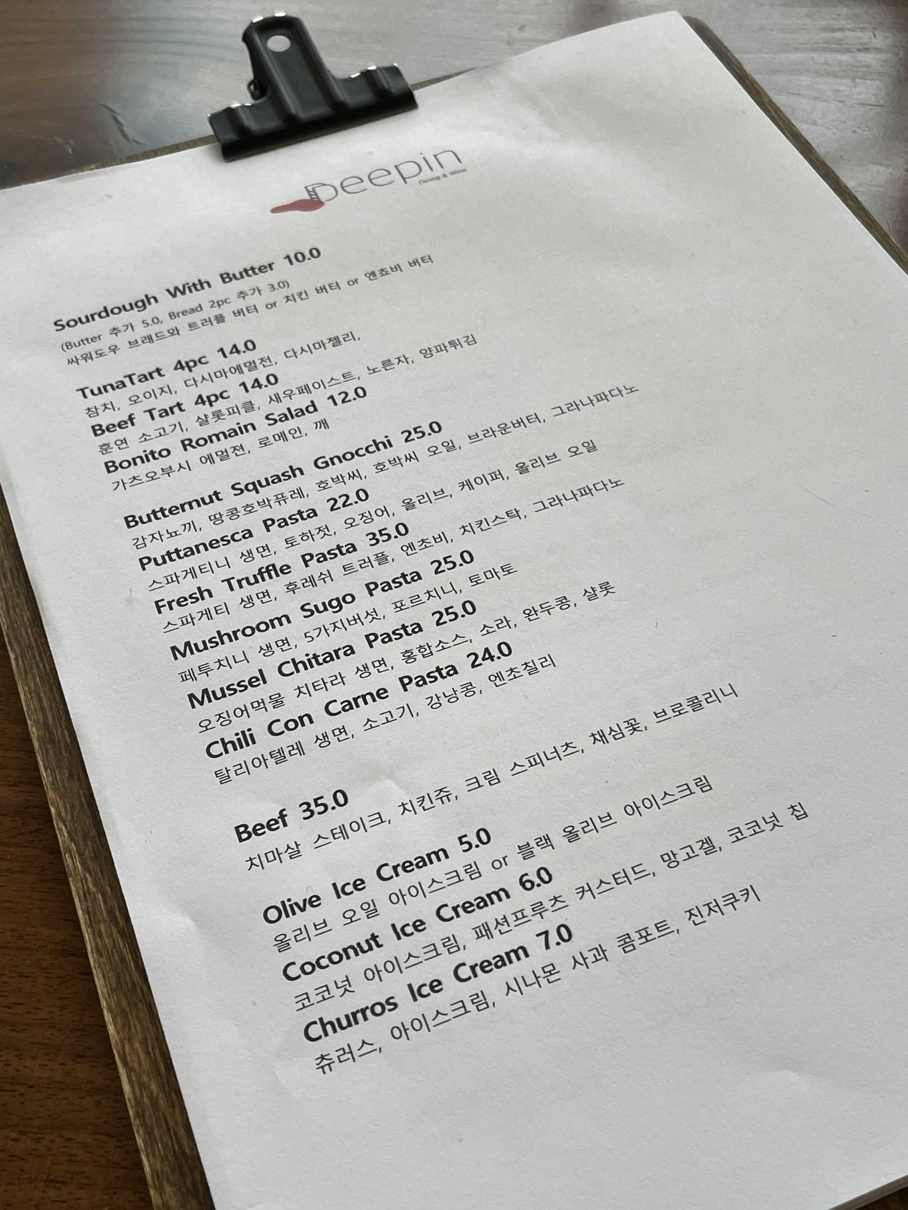 자 이제 메뉴 주문을 해보겠습니다. 디핀 옥수 메뉴들은 가격대가 있는 편이에요. 와인이랑 곁들여 먹는 스타일로 배 채우는 음식들은 아니라고 들었어요. 저는 와인을 못 마시기에 음식들을 다양하게 주문하기로~